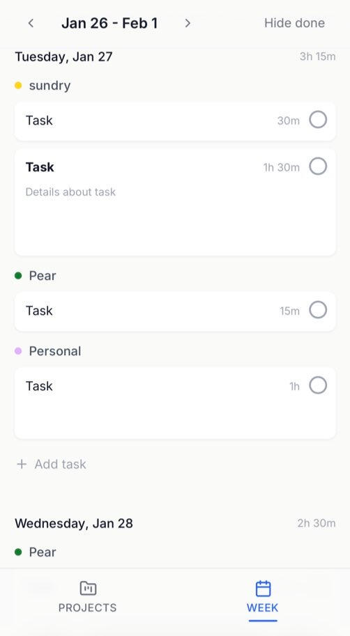 • Calendar integration for seamless flow: projects -> week -> time block